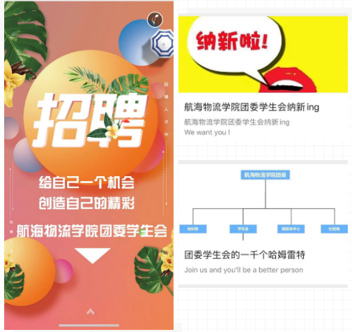 学生会是发展与繁荣校园文化的舞台和基地,是培养大学生全面成才的主要载体,是学院与学生之间沟通的桥梁。在这里,可以充分施展学生的才华,张扬学生的个性,用学生创新的思想为自己的生活勾勒出一张绚丽的蓝图。为了给更多学生展示自己、锻炼自己的机会,我院通过公众号推文、H5易企秀等宣传渠道进行了团委学生会首届纳新宣传工作。
