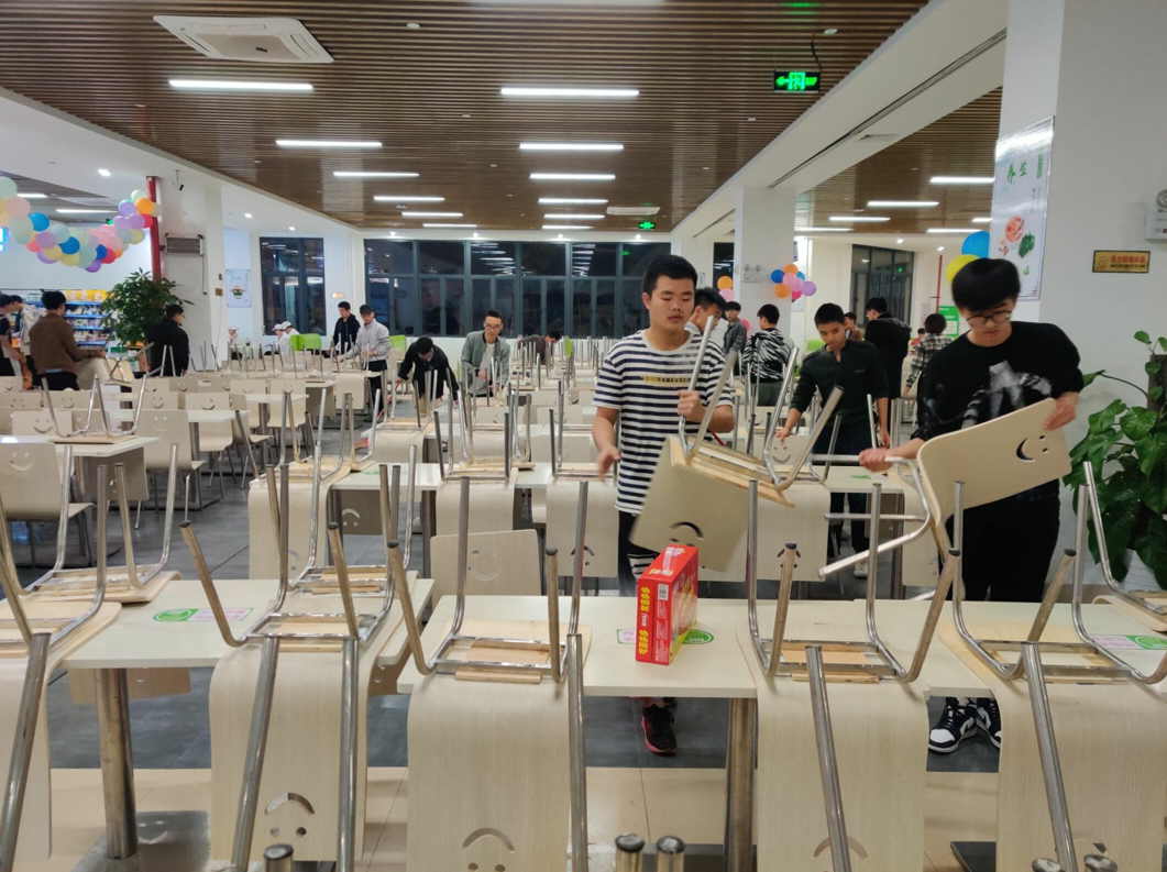 用餐结束后,各辅导员和学院老师与同学们展开各种娱乐活动,整场活动在大家的欢声笑语之中结束。结束之后,同学们自发的清洁着食堂的卫生,还学校一个干净整洁的用餐环境。