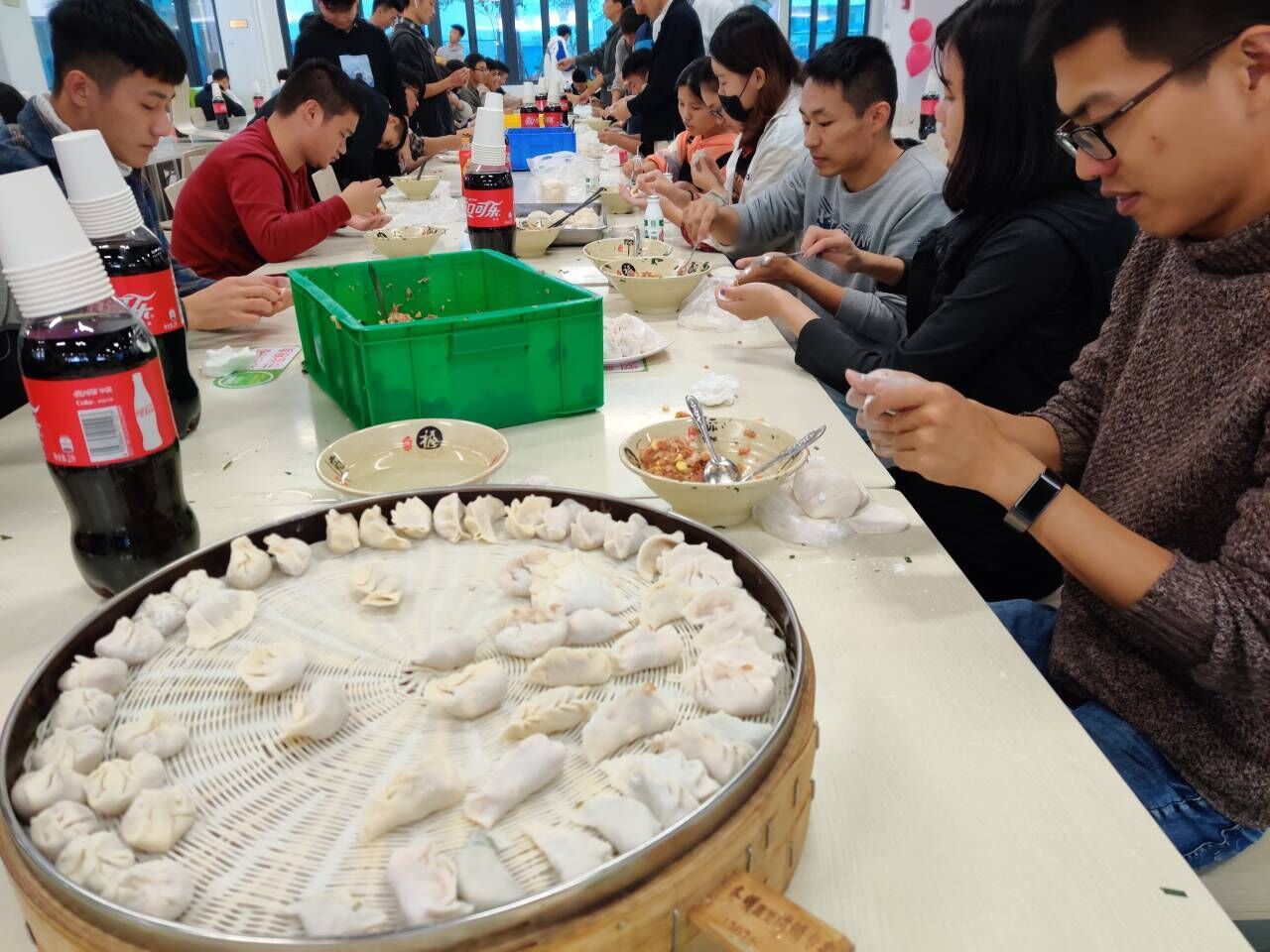 活动举办与下午五点,同学们围坐一团,分工明确,揉和着面团,擀着面皮,包着饺子,期间同学们相互交流着冬至期间家乡的风俗习惯,其包饺子的习惯也彰显出其独特的区域性,有着饱满的东北大米大饺、也有着小巧的柳叶饺,各种不同的习俗文化交融于航海大家庭之中,在同学们包的饺子中一一体现。