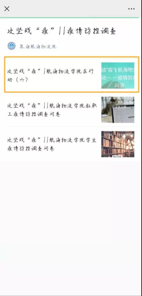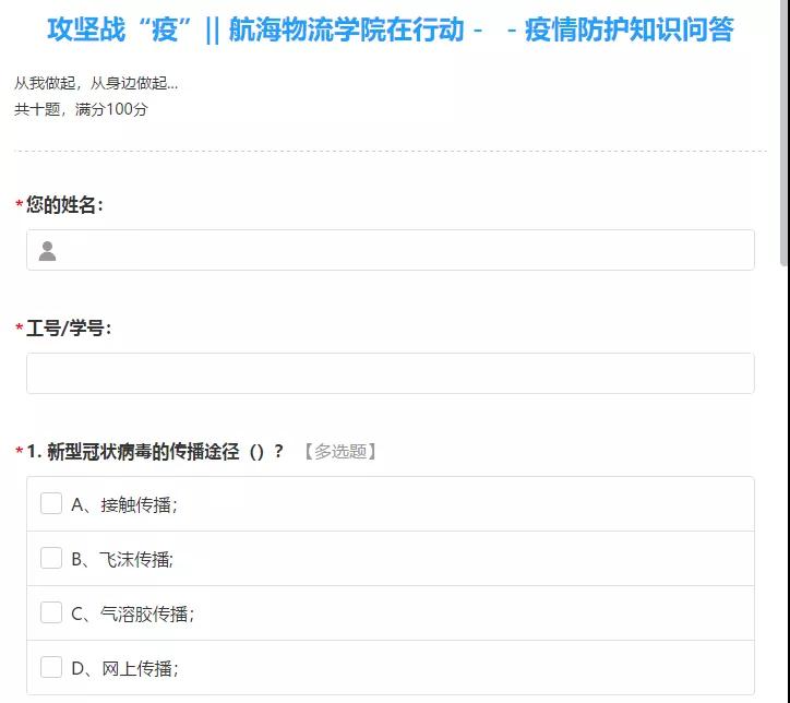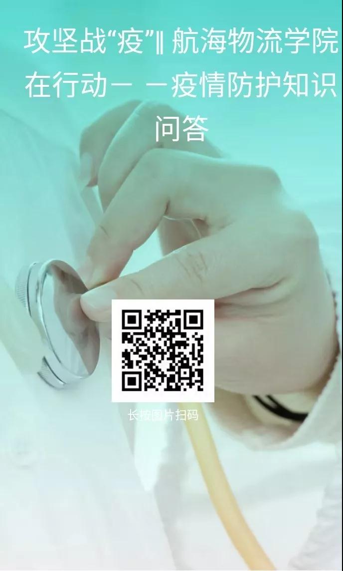 您好!当前,新型冠状病毒感染肺炎疫情严峻,在当前防控新型冠状病毒感染肺炎的严峻斗争中,您的疫情防护知识知多少?请您填写以下的知识问答,记得填完之后看看答题解析以及自己排名顺序哦~!加油!(PS:打开“航海物流学院”官方微信的二级菜单“抗疫调查问卷”,找到“攻坚战“疫”|航海物流学院在行动(六)”即可找到此文章。