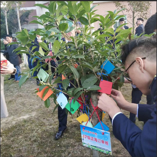 本次助学金颁发的发放,旨在勉励17级与18级订单班同学认真学习、乐观生活吴广华教授、周永煌先生谭维涛船长分别从自己的经验和经历出发,深入浅出地做了简短而又深入人心的演讲。之后,全体参会人员到学院一号教学楼后,种下了有历史纪念意义,挂牌泛海订单班17级和18级的两棵桂花树。