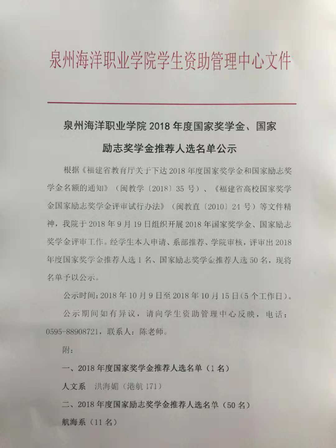 泉州海洋职业学院航海系2018年度国家奖学金、国家励志奖学金推荐人选名单公示