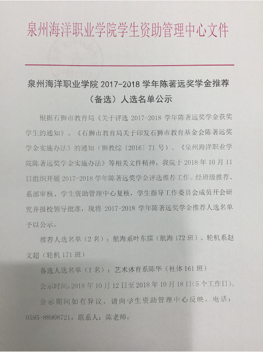 泉州海洋职业学航海系2017-2018学年陈著远奖学金推荐人选名单公示