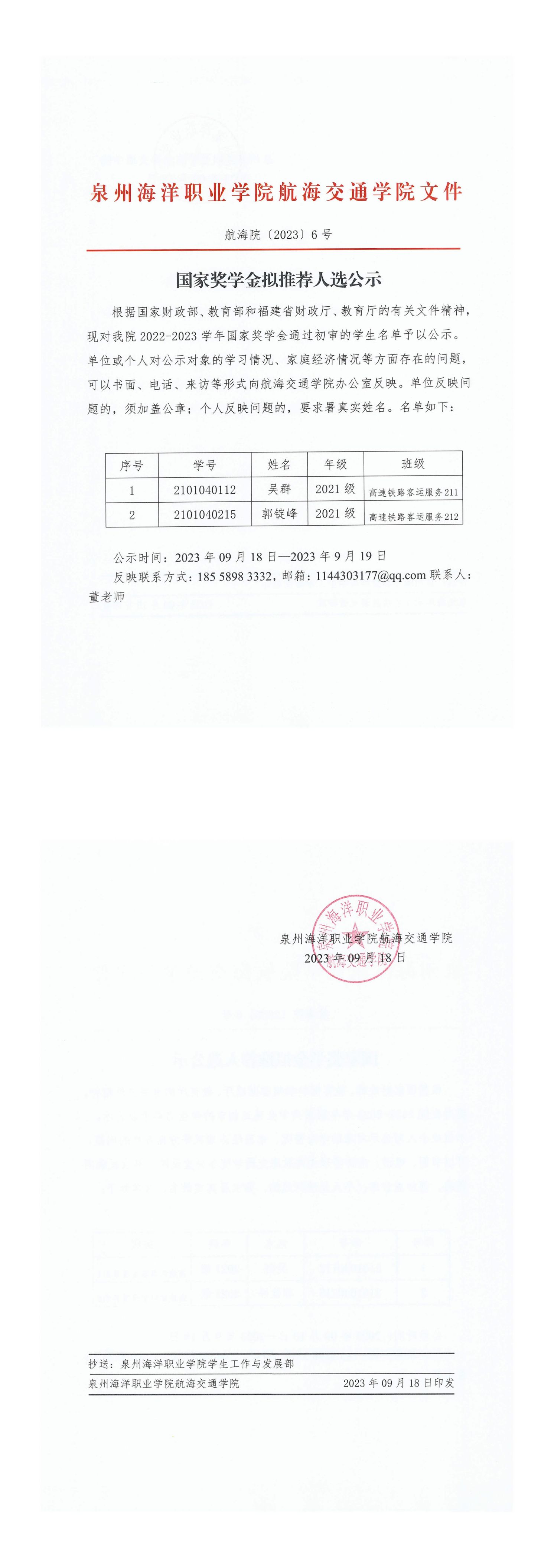 泉州海洋职业学院航海交通学院拟推荐2023年度国家奖学金候选人名单的公示