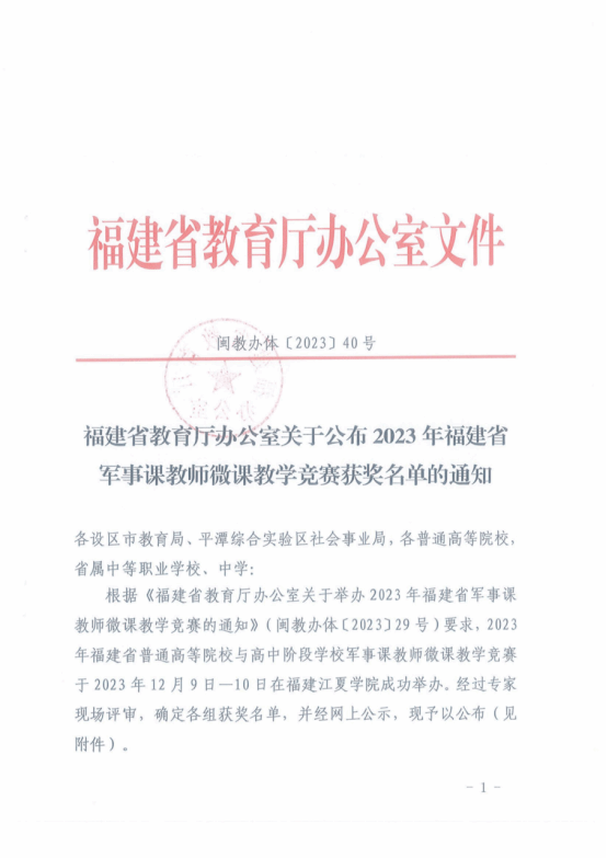 1220日,福建省教育厅发布《关于公布2023年福建省军事课教师微课教学竞赛获奖名单的通知(闽教办体〔2023〕40号),航海交通学院董远志老师的微课《前事不忘,后事之师中国国防历史的主要启示》荣获高校组三等奖。