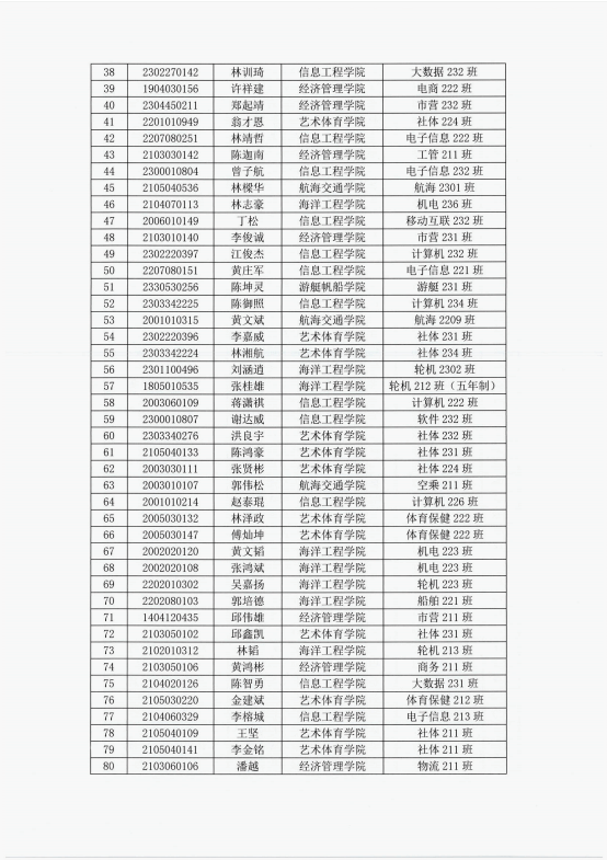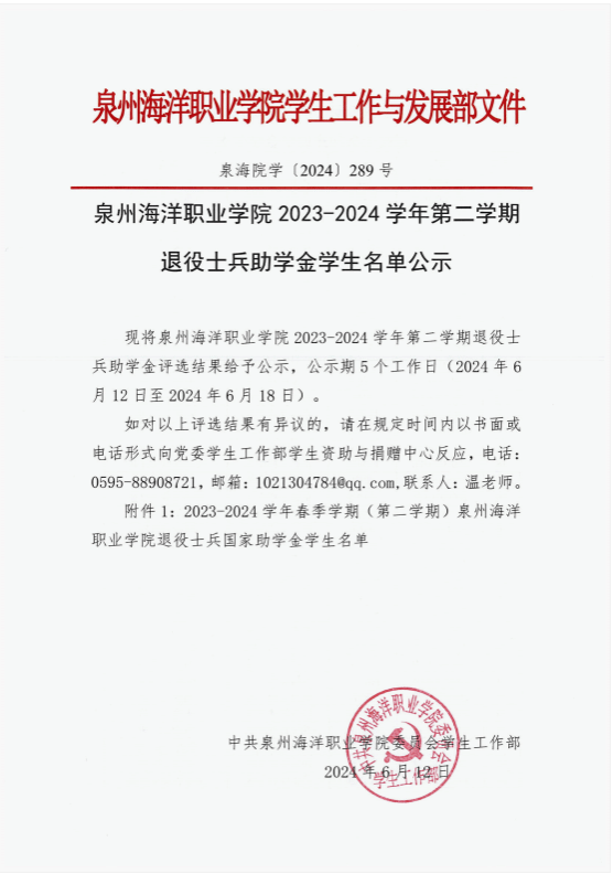 关于泉州海洋职业学院2023-2024学年第二学期退役士兵助学金学生名单的公示