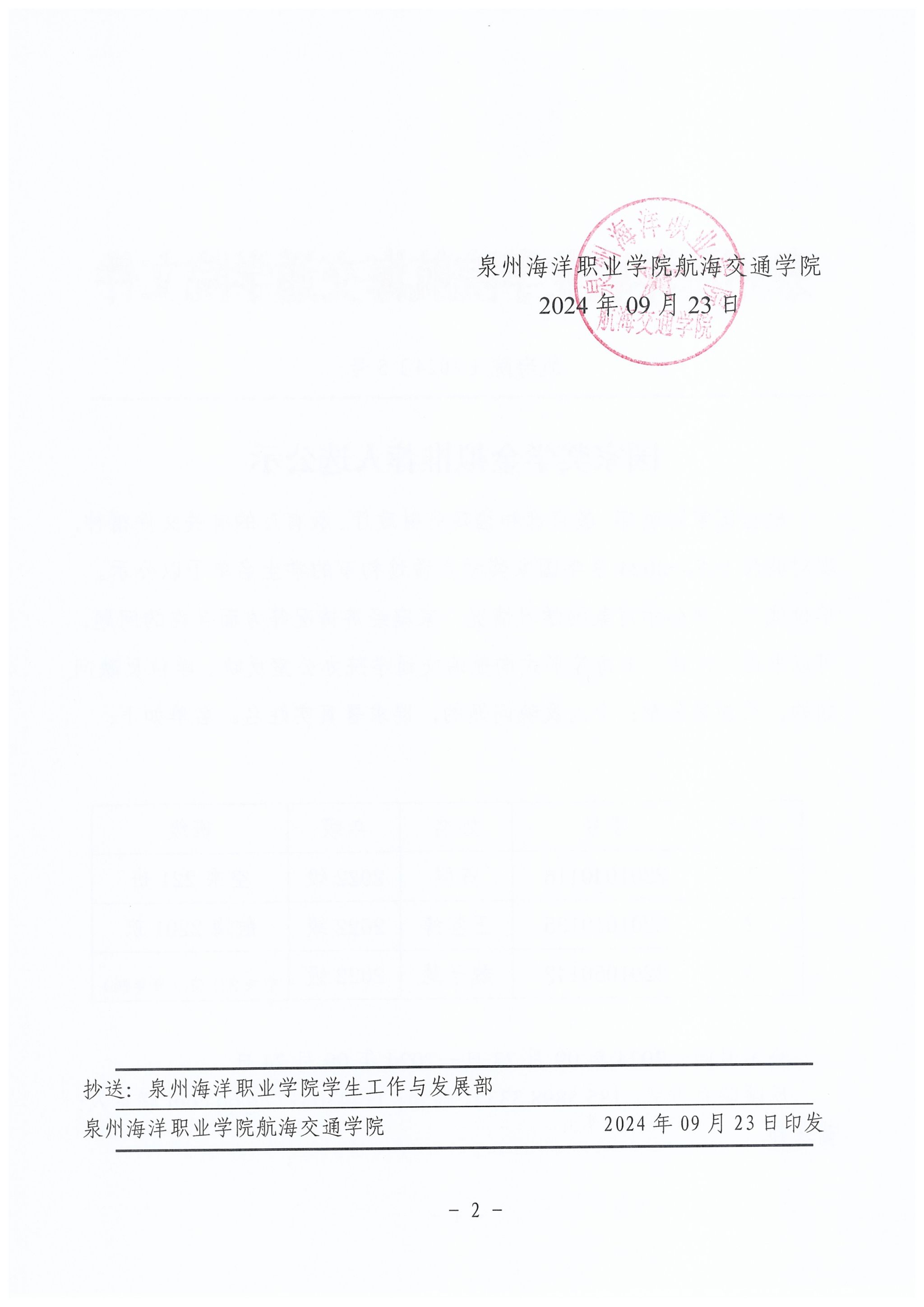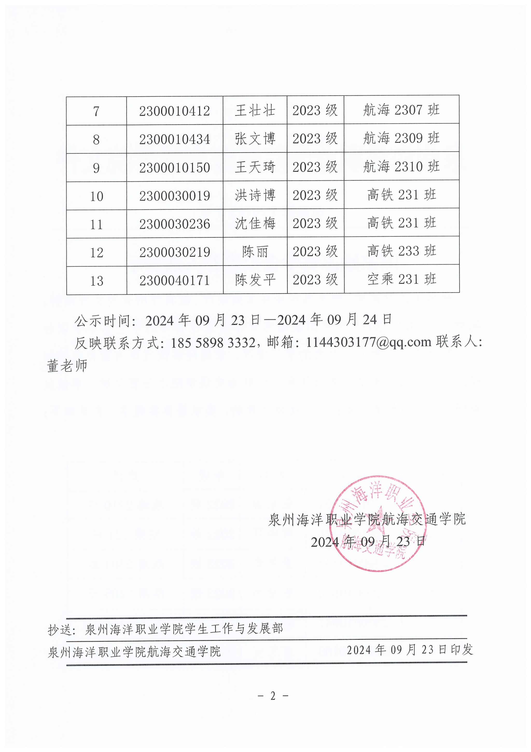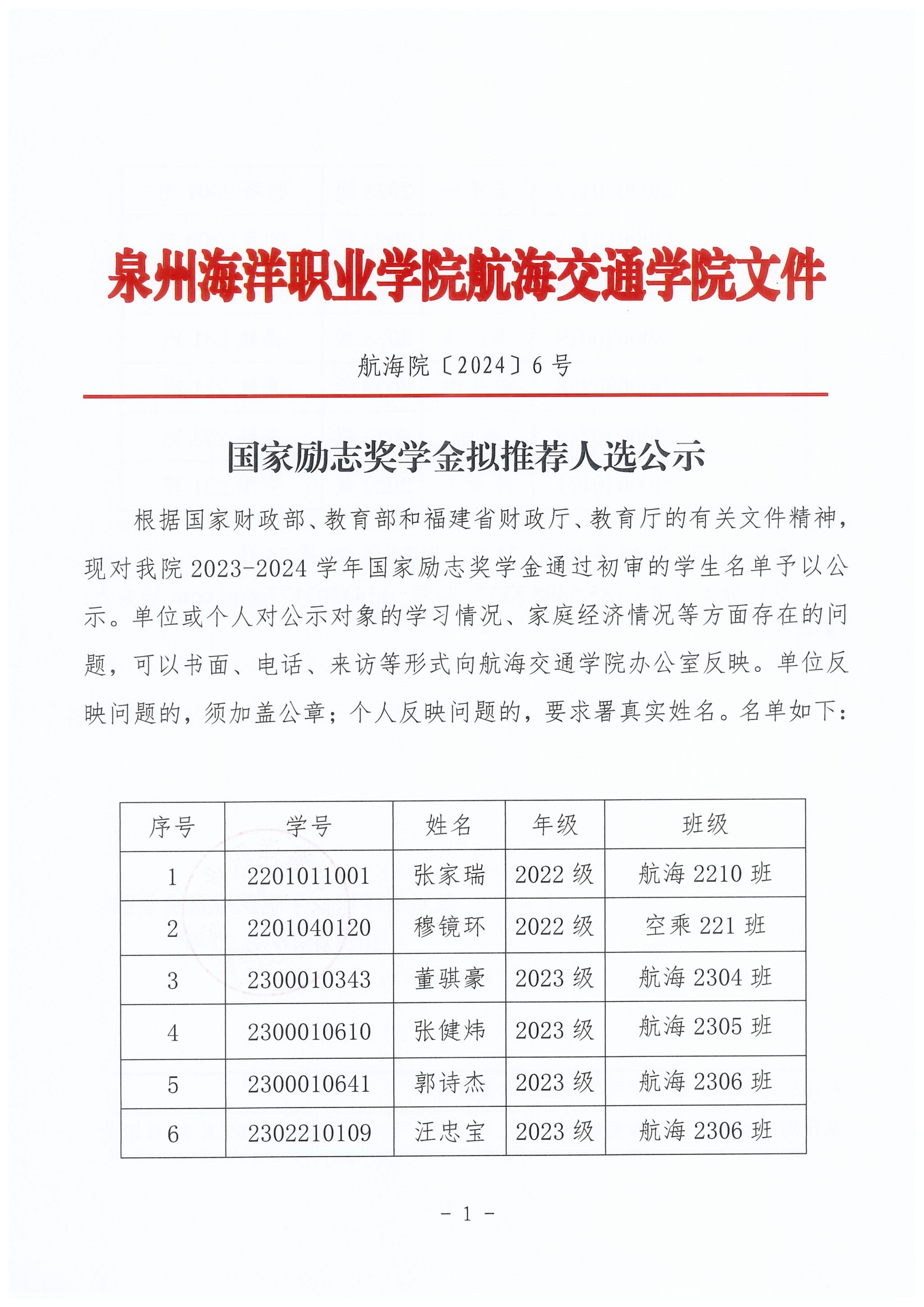 关于泉州海洋职业学院航海交通学院2023-2024学年国家奖学金、国家励志奖学金拟推荐人选的公示