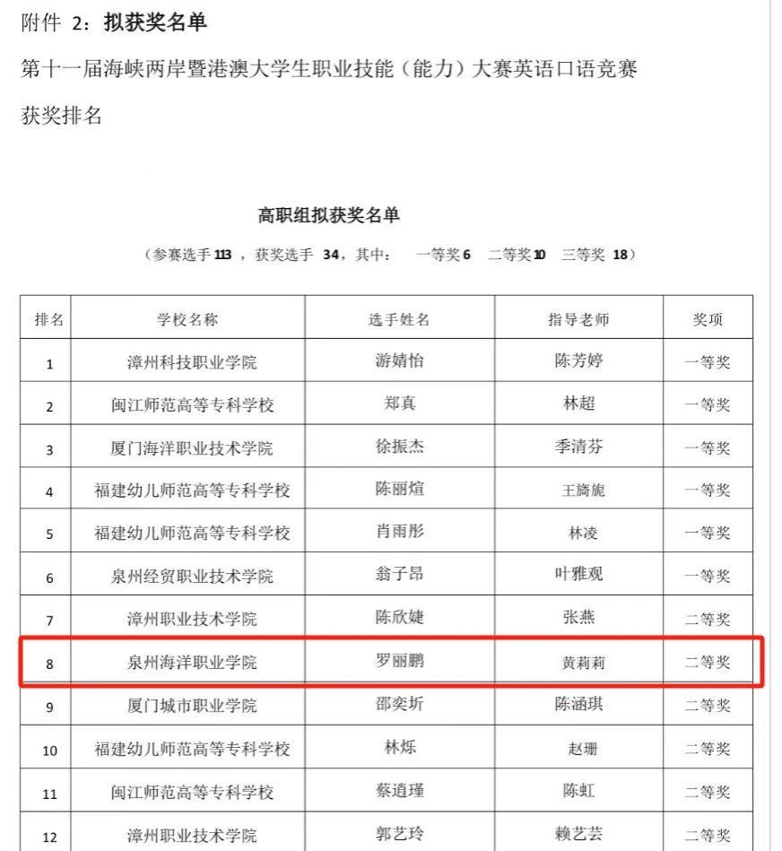 近日,由福建省教育厅、福建省人力资源和社会保障厅及福建省网信办联合举办的“第十一届海峡两岸暨港澳大学生职业技能大赛英语口语竞赛(高职组)”,在福建商学院鼓楼校区圆满收官。我院航海技术专业罗丽鹏同学,从全省各高职院校的一百多名参赛选手中脱颖而出,荣获英语口语竞赛二等奖。