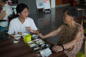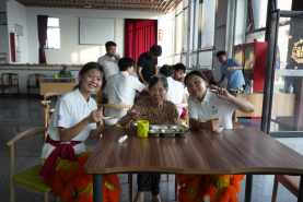 舞狮表演落幕,温情却在延续。学子们与老人们共品餐食,闲话家常,那一张张笑脸,是爱心与陪伴的最好见证。