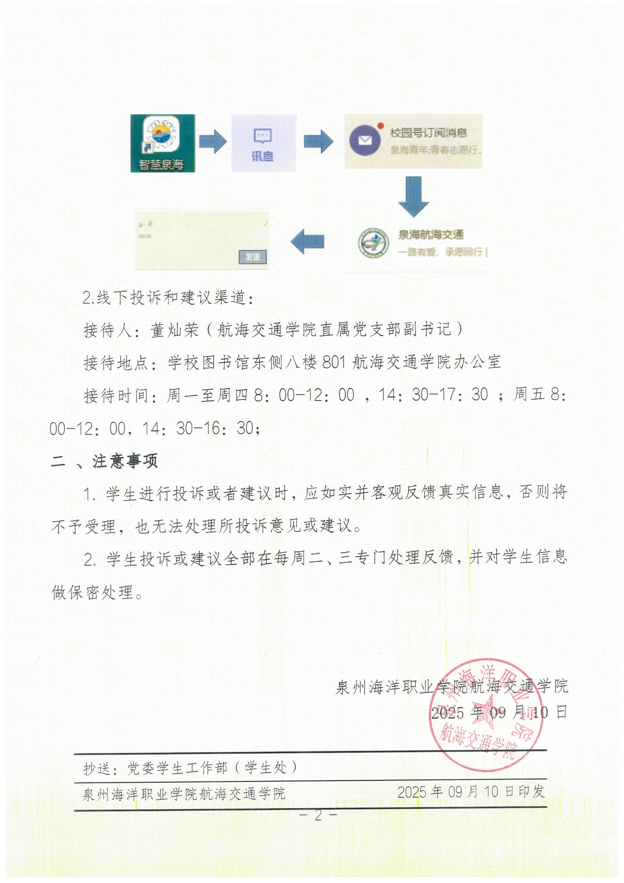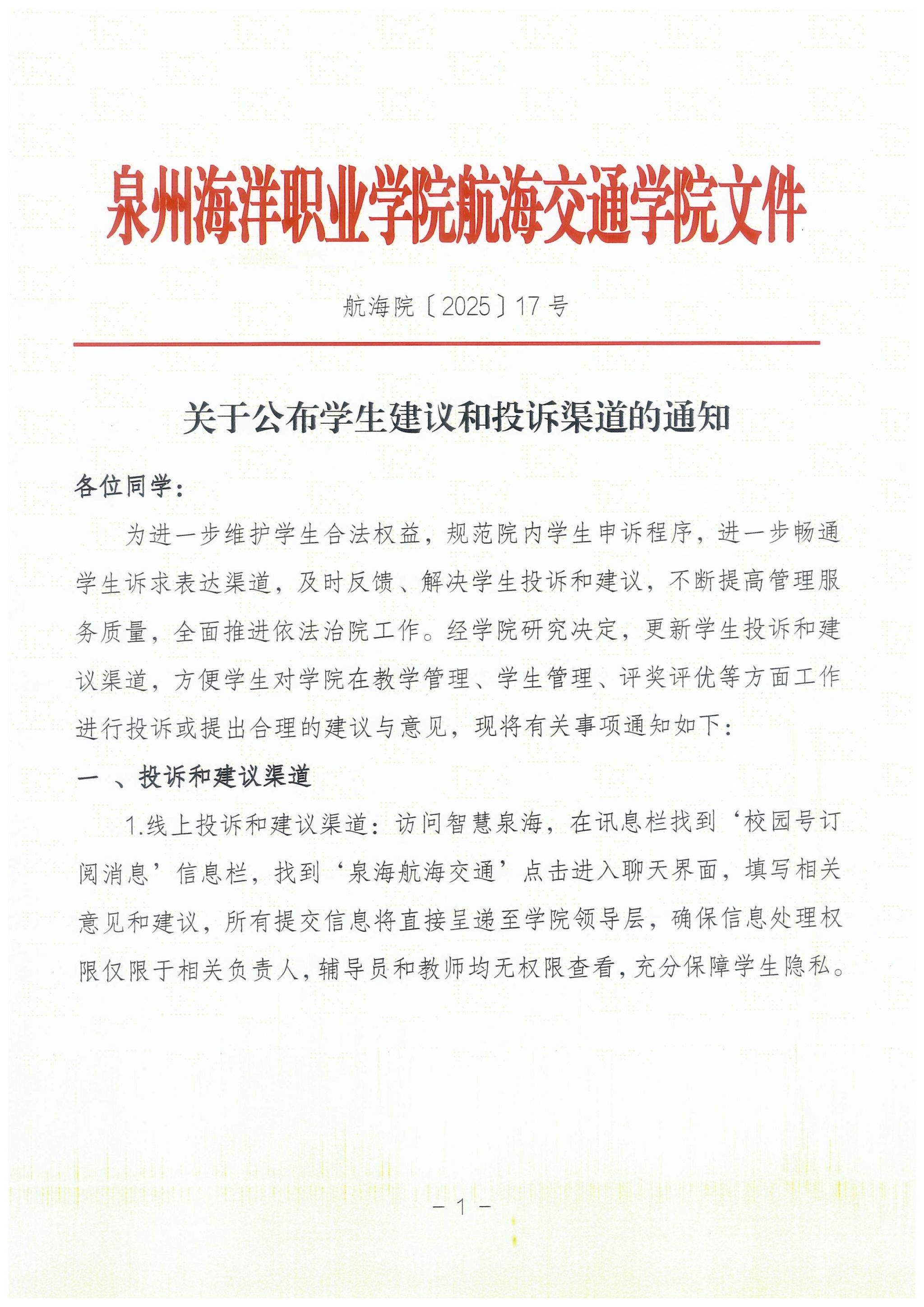 航海院〔2025〕17号关于公布学生投诉和建议渠道的通知
