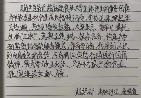 习近平总书记给福建农林大学全体师生的回信,充分体现了对学校的关心与厚爱,为学校发展指明了方向,学校迅速掀起学习热潮,师生们深受鼓舞,表示要牢记嘱托,深耕“三农”。作为学习者,我深感责任重大。今后以回信精神为指引,坚定理想信念,努力学习专业知识,积极投身实践,为推进乡村振兴、建设农业强国贡献自己的力量,像钟梓峰同学一样,把论文写在田野大地上,做新时代强农兴农的排头兵。