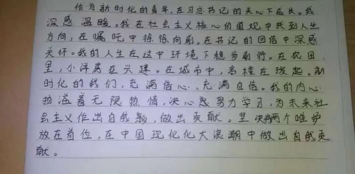 作为新时代的青年,在习近平总书记的关心下成长。我深感温暖。 我在社会主义核心价值观中找到人生方向,在嘱托中徐徐向前。在总书记的回信中深感关怀。我的人生在这种环境下稳步前行。在农田里,小洋房在兴建。在城市中,高楼在拔起。新时化的我们,充满信心、充满自信。我的内心洋溢着无限热情,决心努力学习,为未来社会主义作出贡献。坚决将两个维护放在首位,在中国现代化大浪潮中作出贡献。