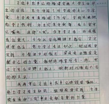 我将牢记习近平总书记的殷切嘱托,努力学习专业知识,积极投身实践,为学校发展和“三农”事业贡献自身的力量。