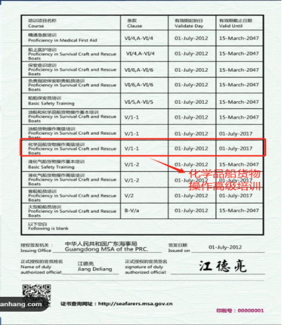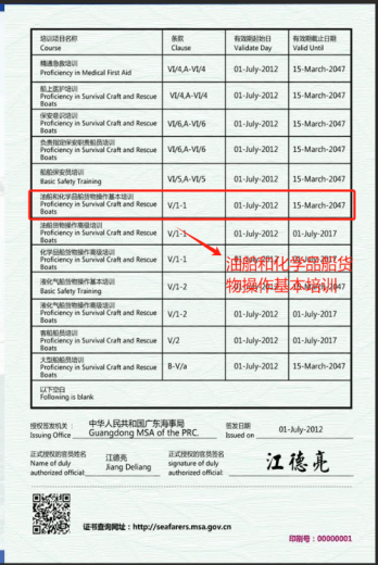 T01 油船和化学品船货物操作基本培训合格证:这是油船和化学品船上工作的基础证书。它涵盖了油船和化学品船货物操作的基本知识,包括货物的特性、安全操作程序等。油化基是长期有效的,适用于在油船或化学品船上工作的所有船员。