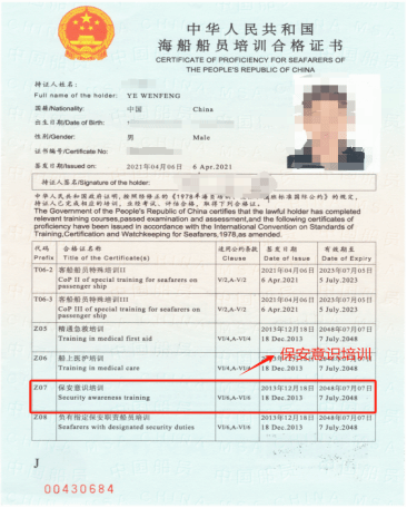 Z07保安意识培训合格证:要求所有的海上工作人员具备,主要是针对船员在船舶保安方面的意识和知识进行培训,以提高他们对船舶保安的认识和应对能力。