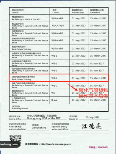 T04 液化气船货物操作基本培训合格证:针对液化气船货物操作的基础证书。该证书的培训内容涵盖了液化气船货物操作的基本知识,包括液化气的特性、安全操作程序、货物装卸、应急处理等方面的知识和技能。有效期通常为5年。