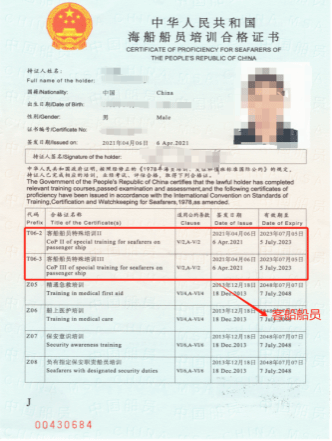 T06 客船船员特殊培训合格证:适用于在客船上服务的所有船员,包括服务人员。此证书要求船员了解客船的特殊操作要求和安全规定,确保乘客的安全和舒适。
