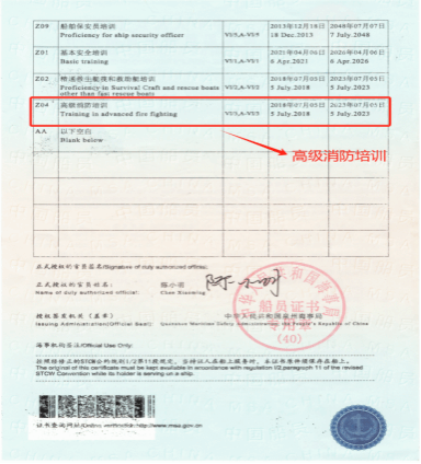 Z04高级消防培训合格证:这个证书要求航海人员了解船舶消防系统的工作原理和操作方法,掌握船舶消防的基本知识和技能。