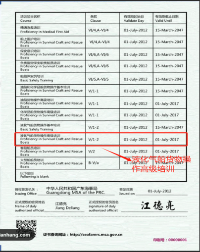 T12 使用气体或者其他低闪点燃料船舶船员高级培训合格证:针对那些在使用气体或其他低闪点燃料船舶上担任高级职务的船员所需持有的进阶培训合格证书。这种证书要求船员具备更高级别的专业知识和技能,以应对更复杂的工作环境和任务。有效期通常为5年。