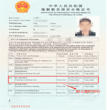 Z06船上医护培训合格证:是航海技术专业高级船员培训中的一种专业证书。主要针对船员在船上的医疗急救知识和技能进行培训,确保船员在紧急情况下能够提供基本的医疗援助和救助。