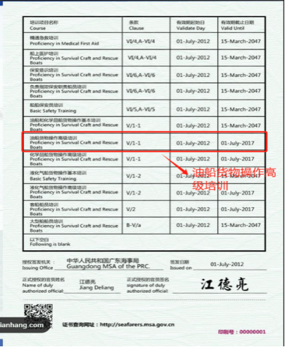 T02 油船货物操作高级培训合格证:这是油船货物操作的进阶证书,适用于油船上的船长、驾驶员、轮机长、轮机员、值班水手、值班机工以及对货物相关操作承担直接责任的船员。油高的有效期为5年。