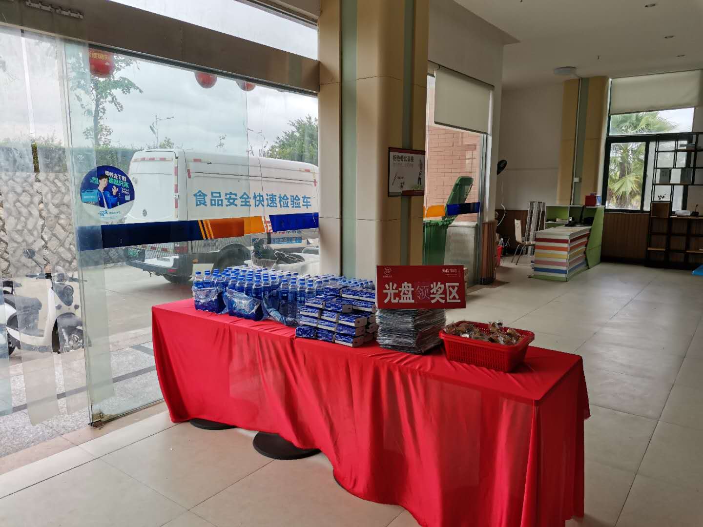 日前,在学校第一食堂餐厅餐具回收区的边上多了一个柜台,放满了矿泉水、纸巾、月饼、鼠标垫等各类食品和用品。台面上“光盘兑奖区”几个大字向就餐师生标明了这个柜台的用意。