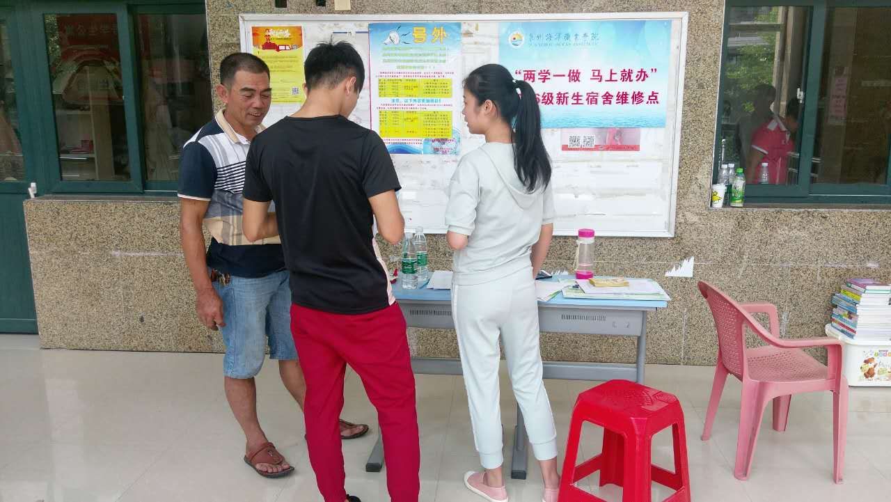 9月3日新生报道日开始,后勤处联合学生第三党支部在各宿舍楼设立“两学一做,马上就办”宿舍维修点,从上午八时至下午十时,现场为新生提供受理维修项目的登记,并立即依序安排木工、水电工进行维修,提高报修效率,及时有效地解决了宿舍修缮问题。