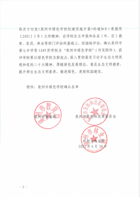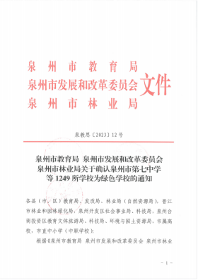 2023年7月7日,泉州市教育局、泉州市发展和改革委员会和泉州市林业局关于确认泉州市绿色学校的通知。我校荣获“泉州市绿色学校”称号。