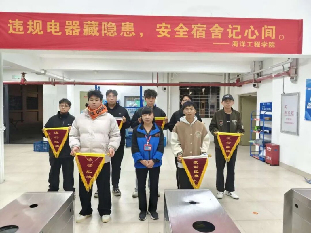 11月19日晚,7号宿舍管理员蔡梅在七号学生宿舍楼一楼大厅为获评满分宿舍的学生代表颁发流动红旗。