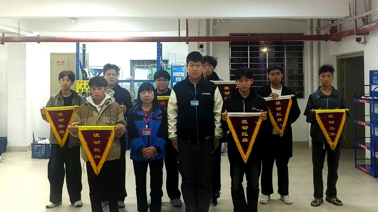 12月3日晚,辅导员徐英杰在七号学生宿舍楼一楼大厅为获评满分宿舍的学生代表颁发流动红旗。