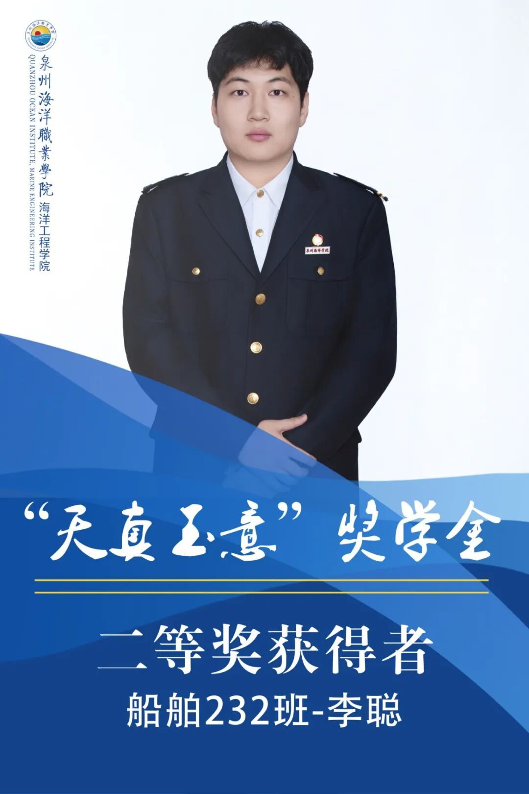 李聪,男,共青团员,就读于泉州海洋职业学院海洋工程学院2023级船舶工程技术专业。上学年综测班级第一、智育班级第二,获得2023年泉州海洋职业学院三好学生,2023年国家励志奖学金国家励志奖学金,2024年泉州海洋职业学院优秀心理骨干,2025年泉州海洋职业学院优秀学生干部。