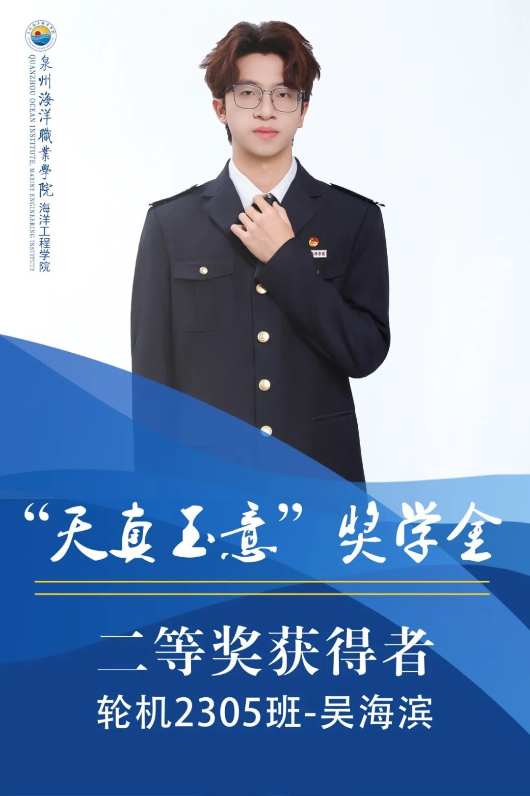 吴海滨,男,共青团员,就读于泉州海洋职业学院海洋工程学院2023级轮机工程技术专业。上学年综测专业第三、智育专业第二,目前持有两项专利,一项实质审查中;获得第十五届全国大学生电子商务“创新、创意及创业”挑战赛泉州海洋职业学院校赛“优秀奖”。