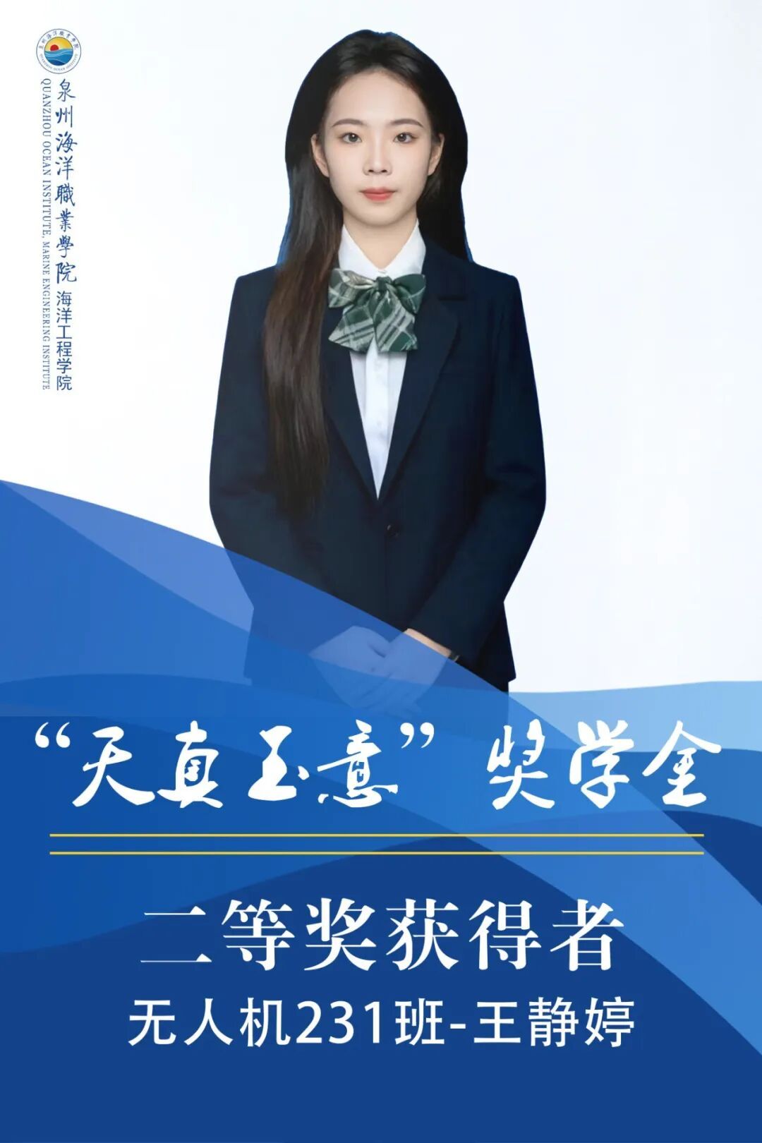 王静婷,女,共青团员,就读于泉州海洋职业学院海洋工程学院2023级无人机应用技术专业。上学年综测、智育均排专业第一,获得2025年泉州海洋职业学院优秀学生干部,2025年泉州海洋职业学院二星级志愿者,2024年泉州海洋职业学院学生资助优秀志愿者,2025年泉州海洋职业学院学生资助宣传大使。