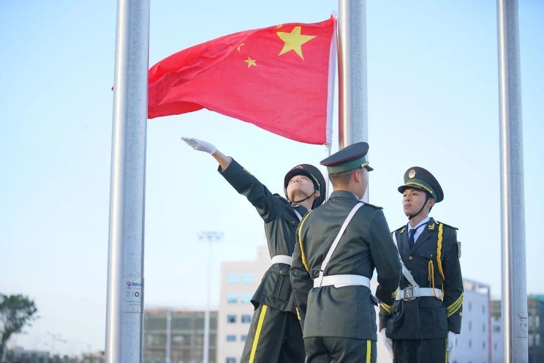 五星与阳光共一色,国旗与朝霞同争辉。国旗护卫队英姿飒爽,步伐铿锵。他们迎着晨光护送国旗向升旗台走去。随着铿锵有力国歌响起,五星红旗正冉冉升起,现场师生致以庄严的注目礼,共唱国歌,致敬祖国。