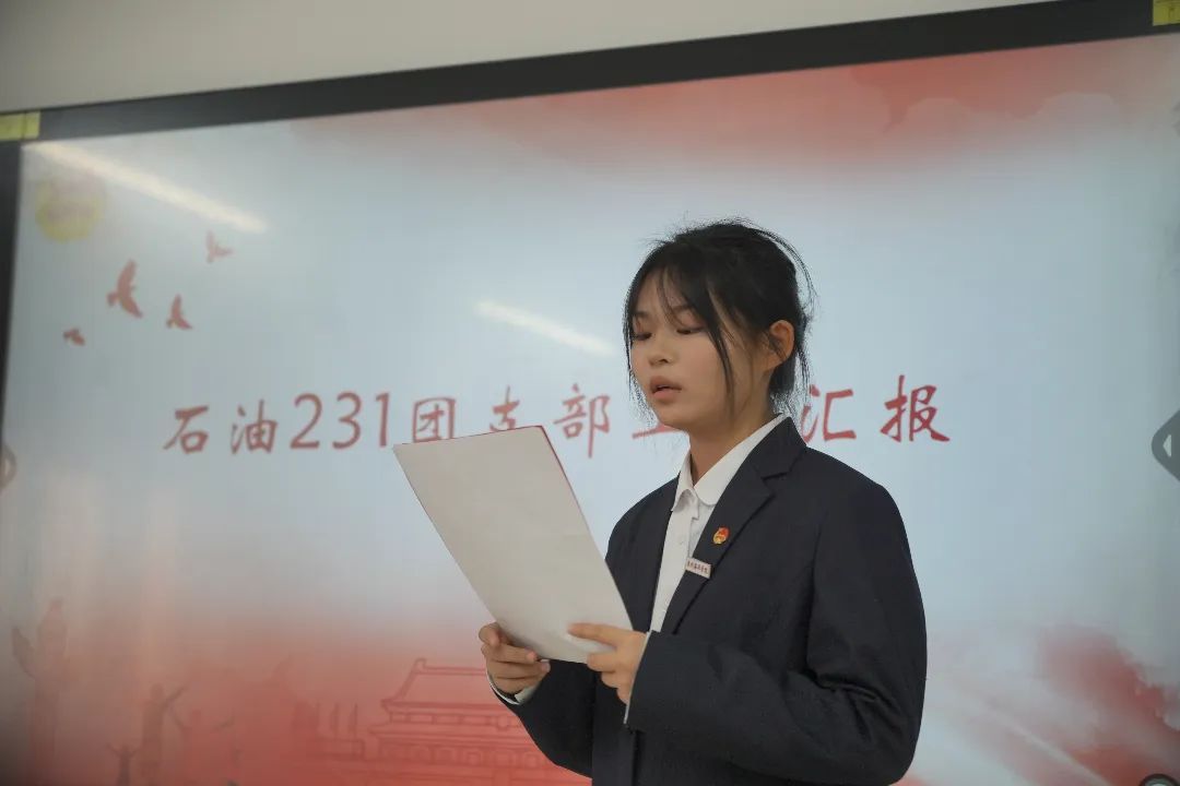 出席会议的领导有校团委书记兼学生工作与发展部副部长屈先锋,海洋工程学院团委书记黄明芳。石油化工专业231团支部林舒怡主持。