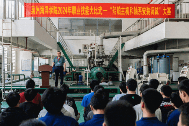 3月25日,泉州海洋学院2024年职业技能大比武“船舶主机和轴系安装调试”比赛在轮机实训中心一楼举行。出席本次比赛的有副校长黄瑞梅,海洋工程学院院长陈景锋、党支部书记周甜、副书记俞建梁。