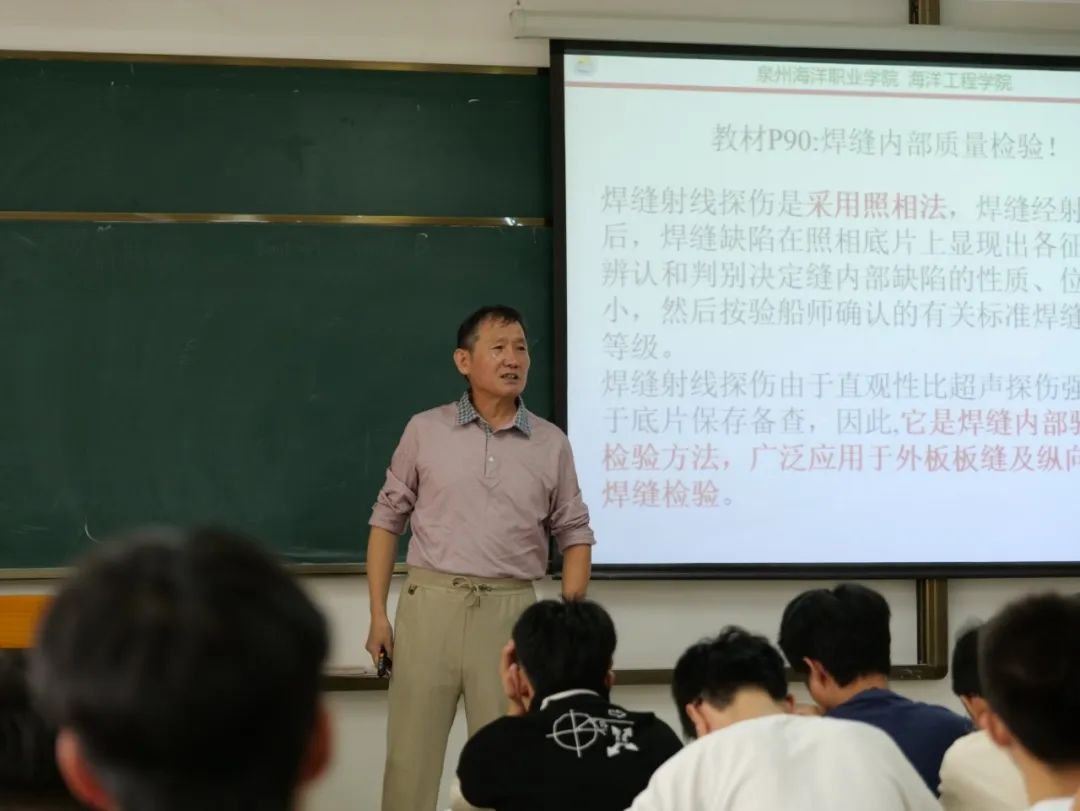 本次观摩课由学院朱新河教授主讲,主讲课程为《船用金属材料检验》。在课堂教学中,朱教授通过介绍知识目标和能力目标导入知识点,为同学们详细讲解钢材检验以及焊接材料检验两个知识点,帮助同学们深刻理解了船用金属材料检验是一个复杂且严谨的过程,对于确保船舶的安全性和可靠性至关重要。他渊博的知识储备、对教学的热情、幽默风趣的语言,让这堂课变得生动而富有启发性,很好地提升了同学们的学习积极性。