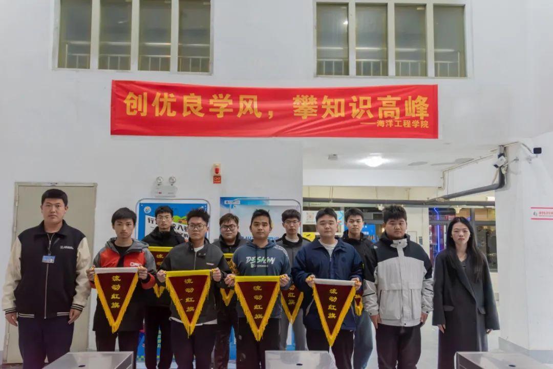 3月6日晚,学院辅导员徐英杰在8号学生宿舍楼一楼大厅为获评满分宿舍的学生代表颁发流动红旗。