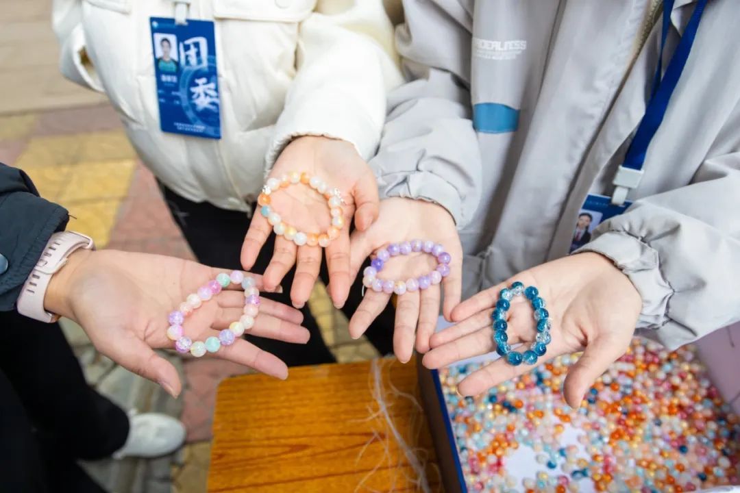 在“时光手链”制作环节中,活动负责人将提前准备好的彩色丝线、珠子和小饰品整齐地摆放在桌上。同学们纷纷挑选自己喜欢的材料,亲手制作“时光手链”。有的同学将手链送给朋友,表达对彼此的珍视;有的送给妈妈,传递对母亲的感恩;还有的同学选择留给自己,寓意留住当下的美好时光。