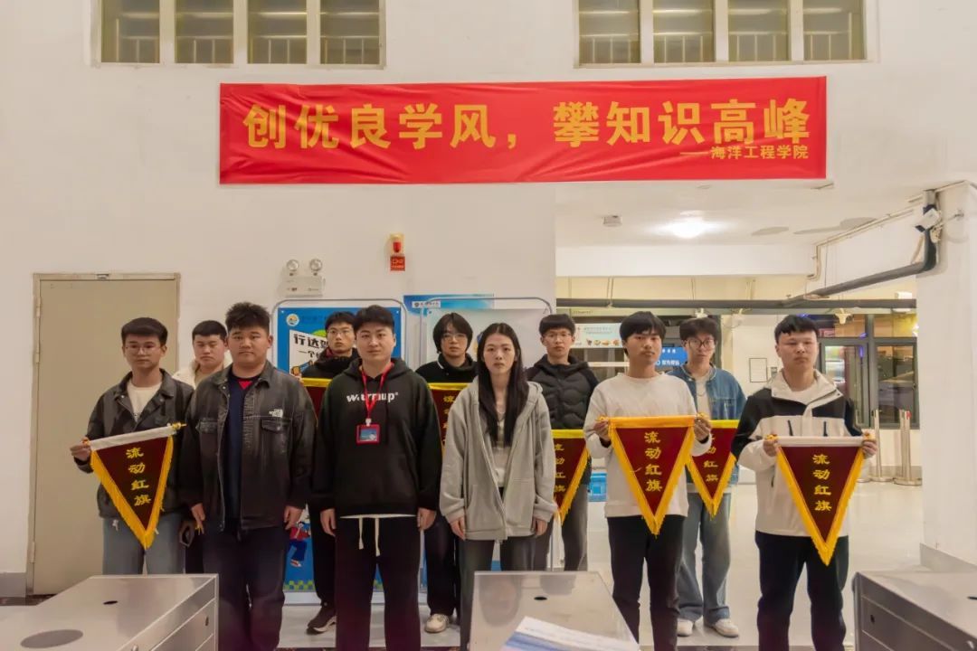 3月13日晚,学院辅导员韩硕在8号学生宿舍楼一楼大厅为获评满分宿舍的学生代表颁发流动红旗。