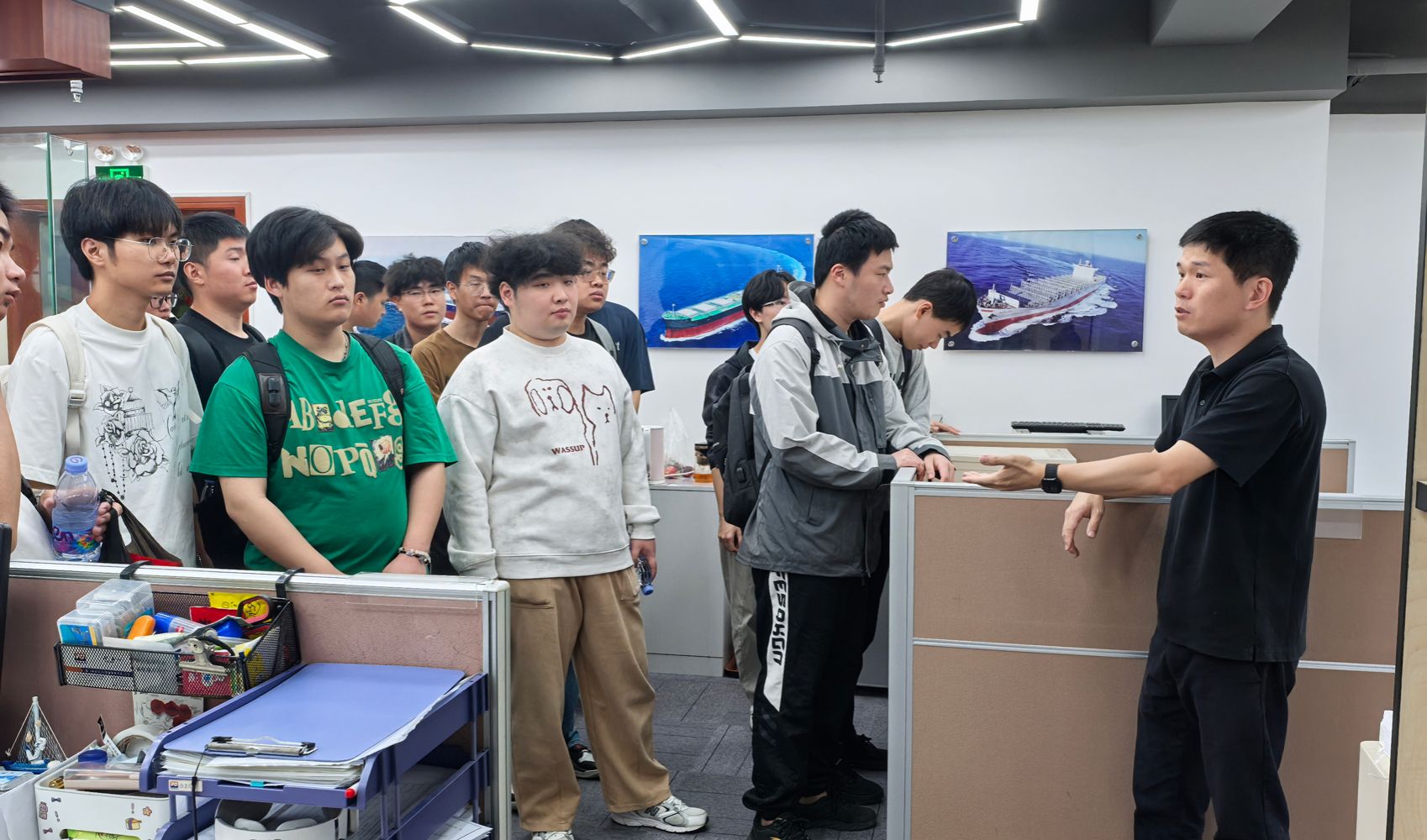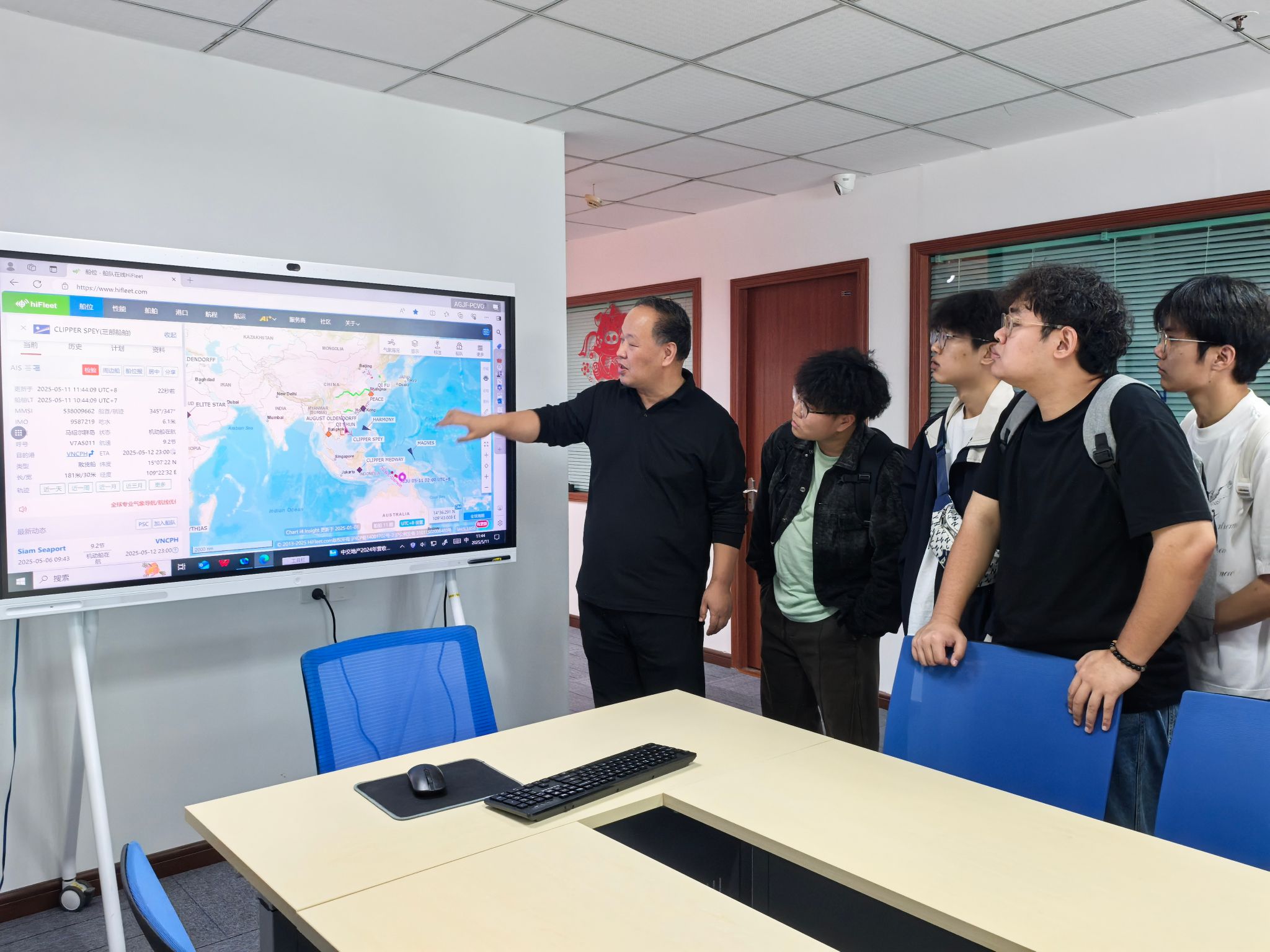 座谈会后,师生在陈滨鸿的带领下参观了企业办公区域及实训中心。培训总监谭维涛船长结合照片和亲身经历向同学们分享了远洋航行途中的逸闻趣事,还通过船舶跟踪系统结合专业知识介绍了各条航线的特色和需要注意的地方,同学们纷纷表示“理论与实践的结合令人受益匪浅”。