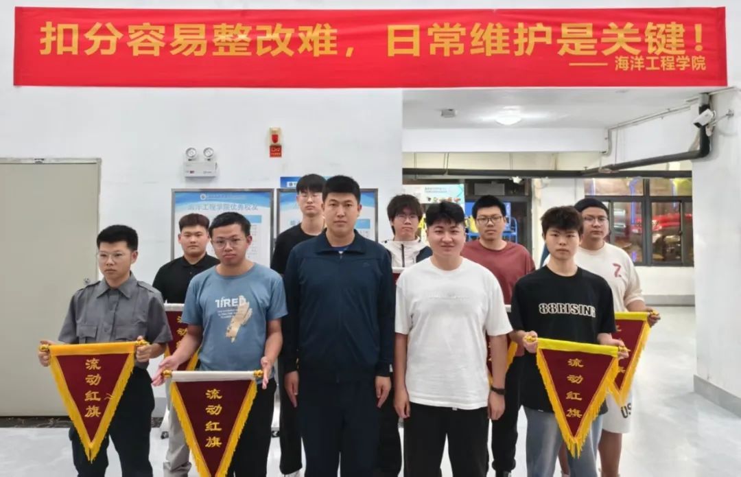5月29日晚,学院辅导员徐英杰和韩硕在8号学生宿舍楼一楼大厅为获评满分宿舍的学生代表颁发流动红旗。
