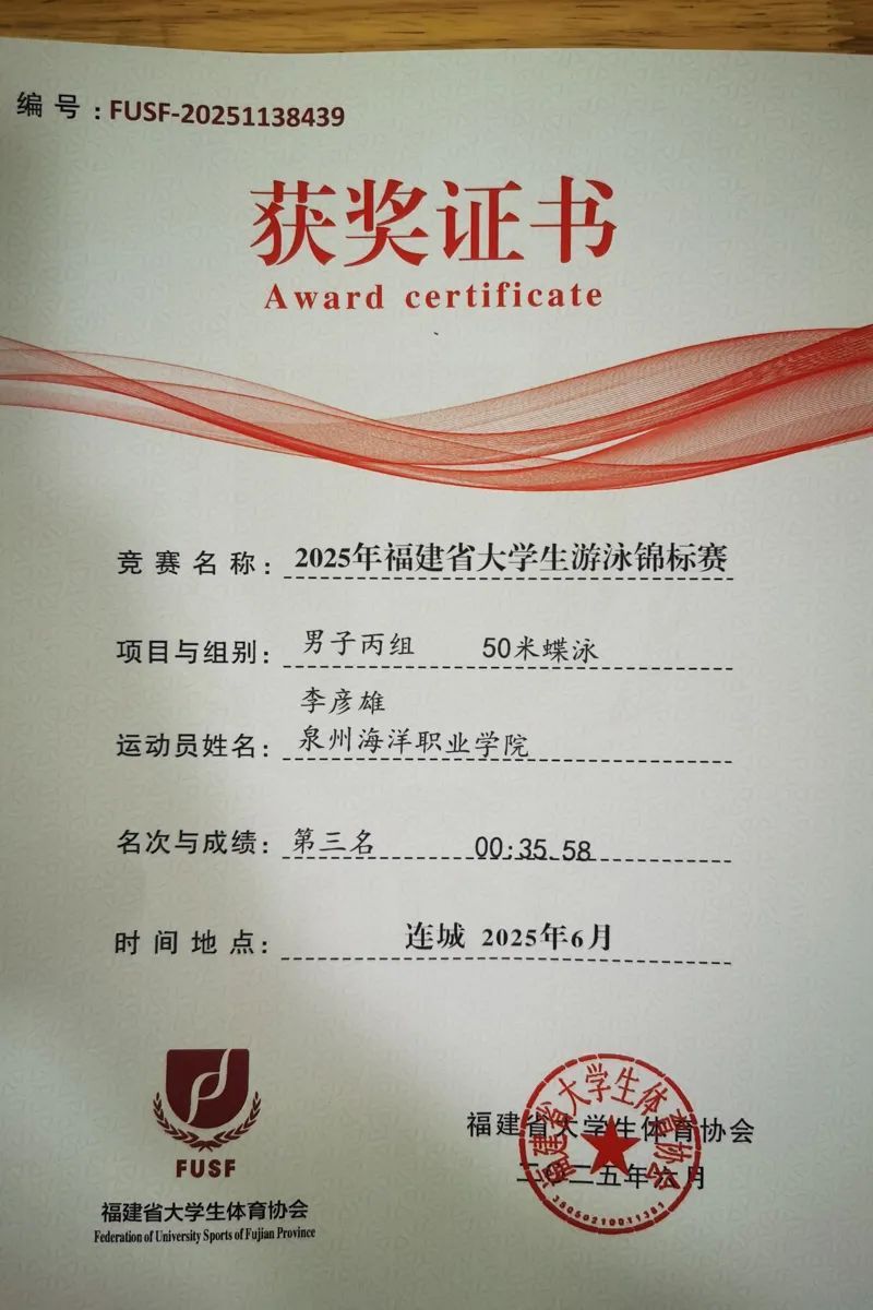 在近日结束的2025年福建省大学生游泳锦标赛中,来自泉州海洋职业学院海洋工程学院的李彦雄,以出色的爆发力、稳定的发挥和对节奏的精准把控,斩获男子丙组仰泳100米第二名、50米第三名,蝶泳50米第三名的优秀成绩!