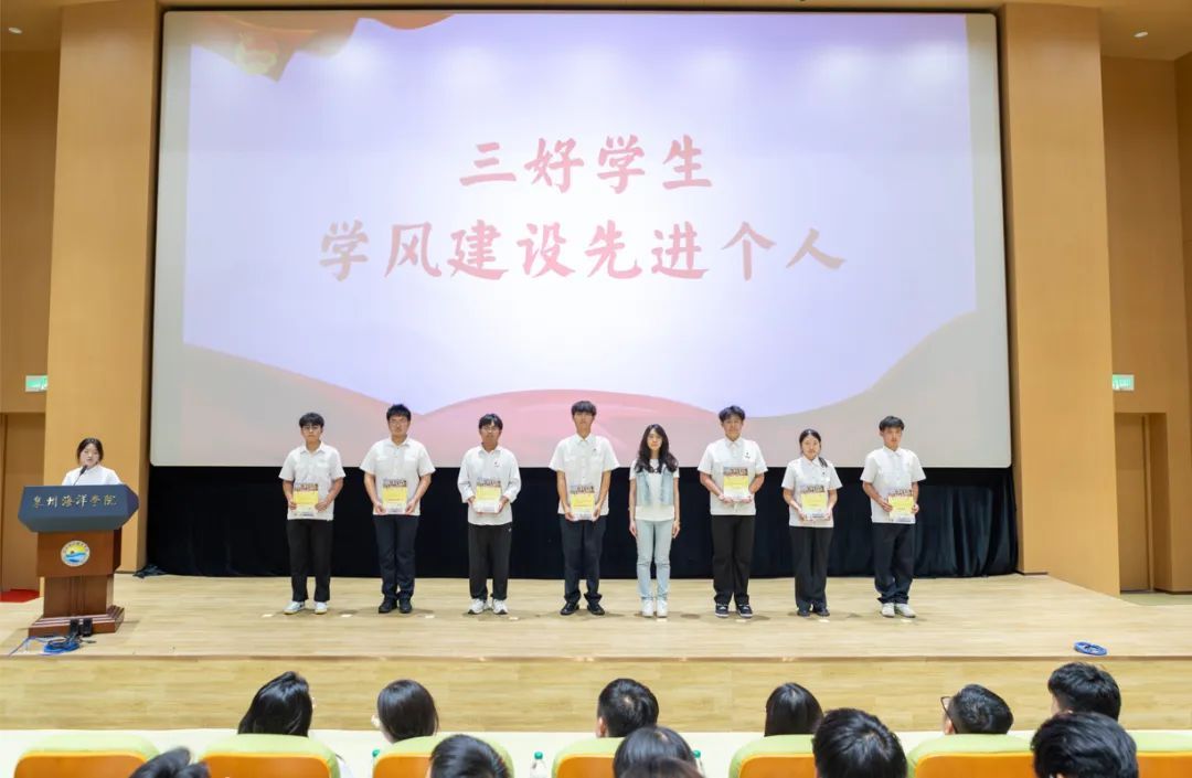 何思琪为获“三好学生”和“学风建设个人”称号的同学颁奖 林荧为获“优秀学生干部”称号的同学颁奖 韩硕为获“优秀学生标兵”称号的同学颁奖 颁奖结束后,冷鑫作为获奖代表分享获奖感言。她首先表达了获表彰的荣幸与感恩之情。随后回顾了备赛“三创比赛”时团队熬夜打磨方案、积极参与各类活动以及平衡学业和社团工作的经历。冷鑫表示,这些艰辛付出都是成长路上的宝贵财富,每一份成绩的取得都源于对目标的执着努力。她鼓励同学们踊跃参与活动,珍惜过程中积累的经验。此外,冷鑫向学校、老师和同学表达了衷心感谢,并指出荣誉不仅是对过去努力的肯定,更是未来前进的动力。她呼吁新时代大学生深耕专业知识,关注社会发展需求,将个人成长与国家建设紧密结合,以谦逊务实的态度投入学习与实践,在追求卓越的道路上不断奋进。