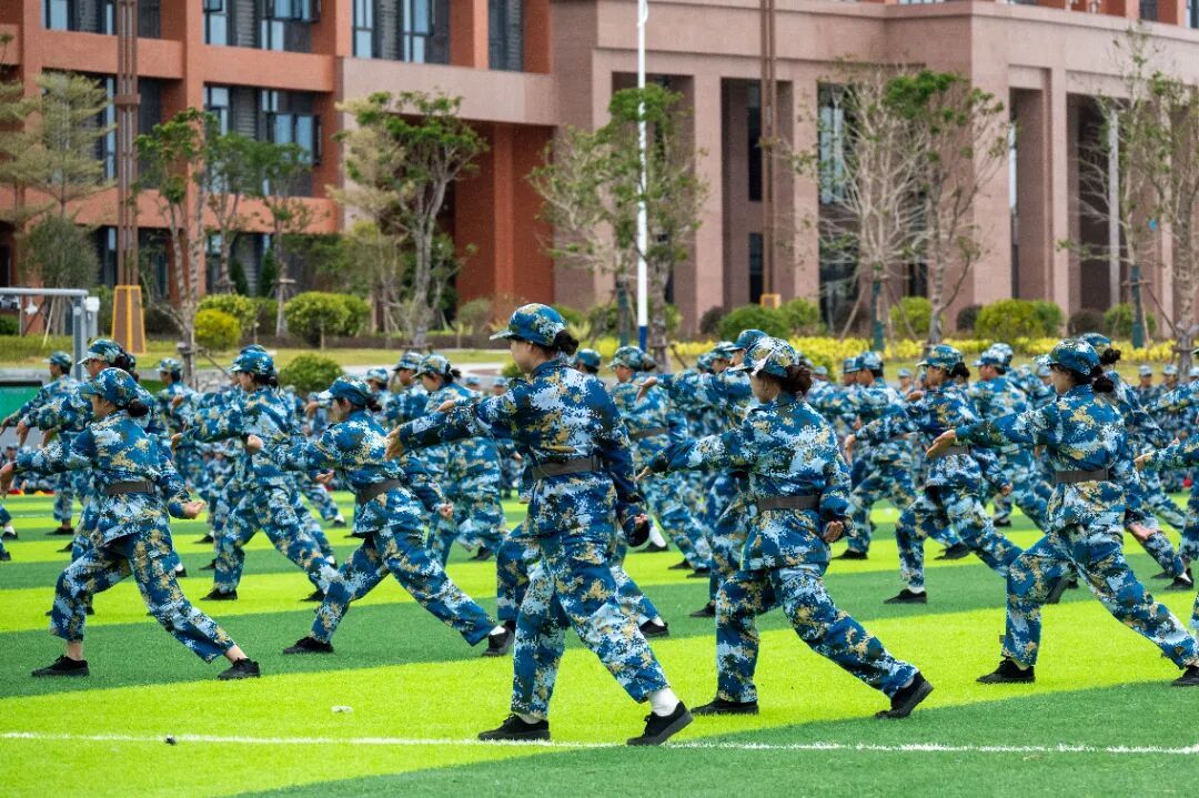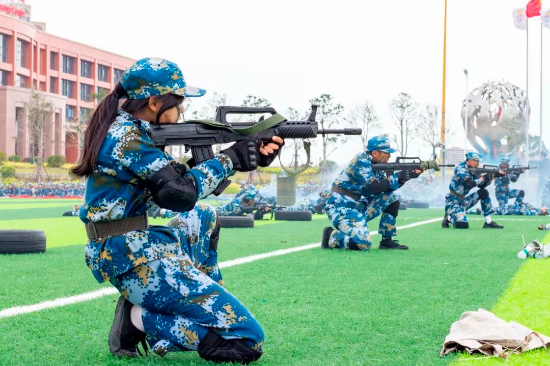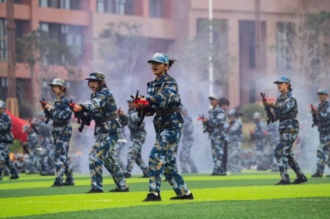 新生们化身"热血尖兵",手持训练枪展开刺杀操表演。"杀!杀!杀!"的呐喊声震耳欲聋,突刺、防刺、转身等动作干净利落、协调一致。汗水浸湿了迷彩服,却浇不灭他们眼中的锐气,每一个动作都凝聚着刻苦训练的汗水,展现了泉海学子不畏艰难的铁血豪情。
