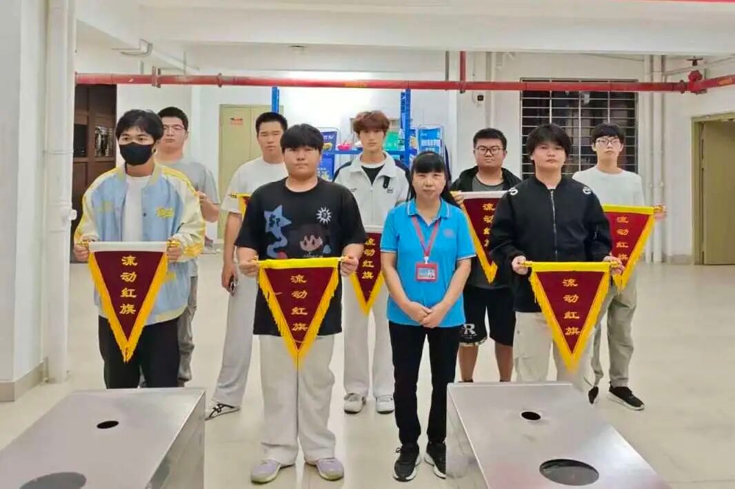 11月5日晚,七号宿舍管理员蔡梅在七号学生宿舍楼一楼大厅为获评满分宿舍的学生代表颁发流动红旗。
