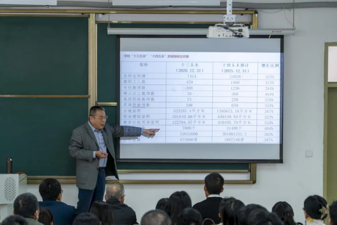会上,陈景锋带领全体教职工细致逐条学习了学校“十五五”发展规划,深入解读了学校在“十四五”期间取得的成果、当前存在的问题以及“十五五”期间面临的机遇与挑战。通过对比“十三五”末与“十四五”末的关键发展指标,学院进一步明确了自身发展的基础与差距。