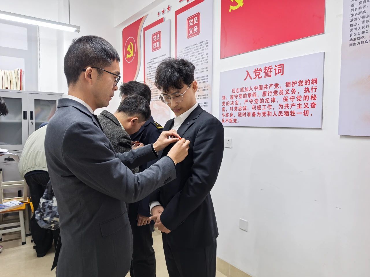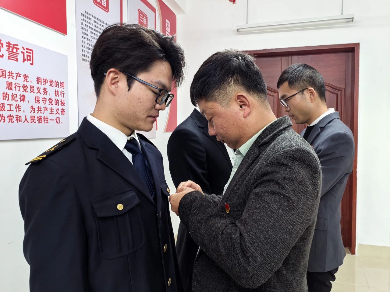 仪式上,周甜和俞建梁亲手为新党员佩戴党徽。一枚枚党徽在胸前闪耀,不仅是身份的象征,更是责任与使命的传递。