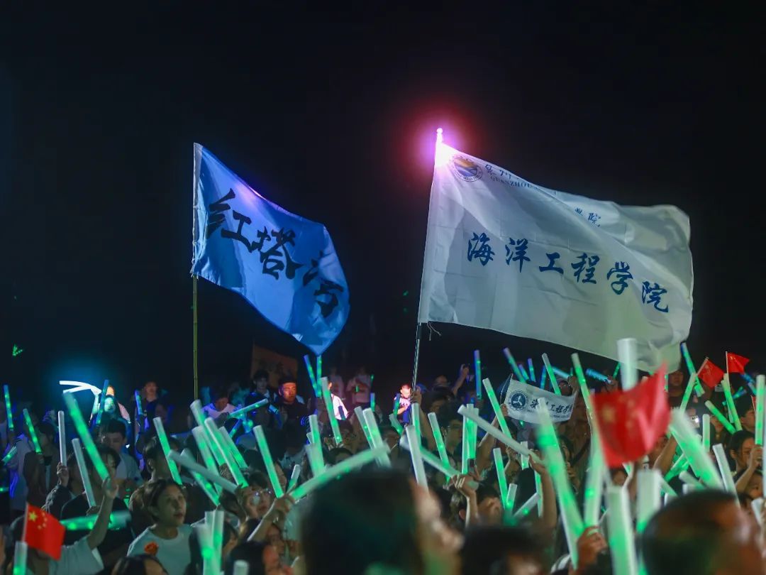 活动现场,灯光璀璨,海风轻拂,带来了青春的活力与自由的气息。舞台上,乐队激情四射,吉他和鼓点交织出动感的旋律,歌声穿透夜空,与海浪声交织成一首动人的交响曲。同学们站在舞台前,挥舞着荧光棒、小红旗,随着音乐摇摆,脸上洋溢着兴奋的笑容。