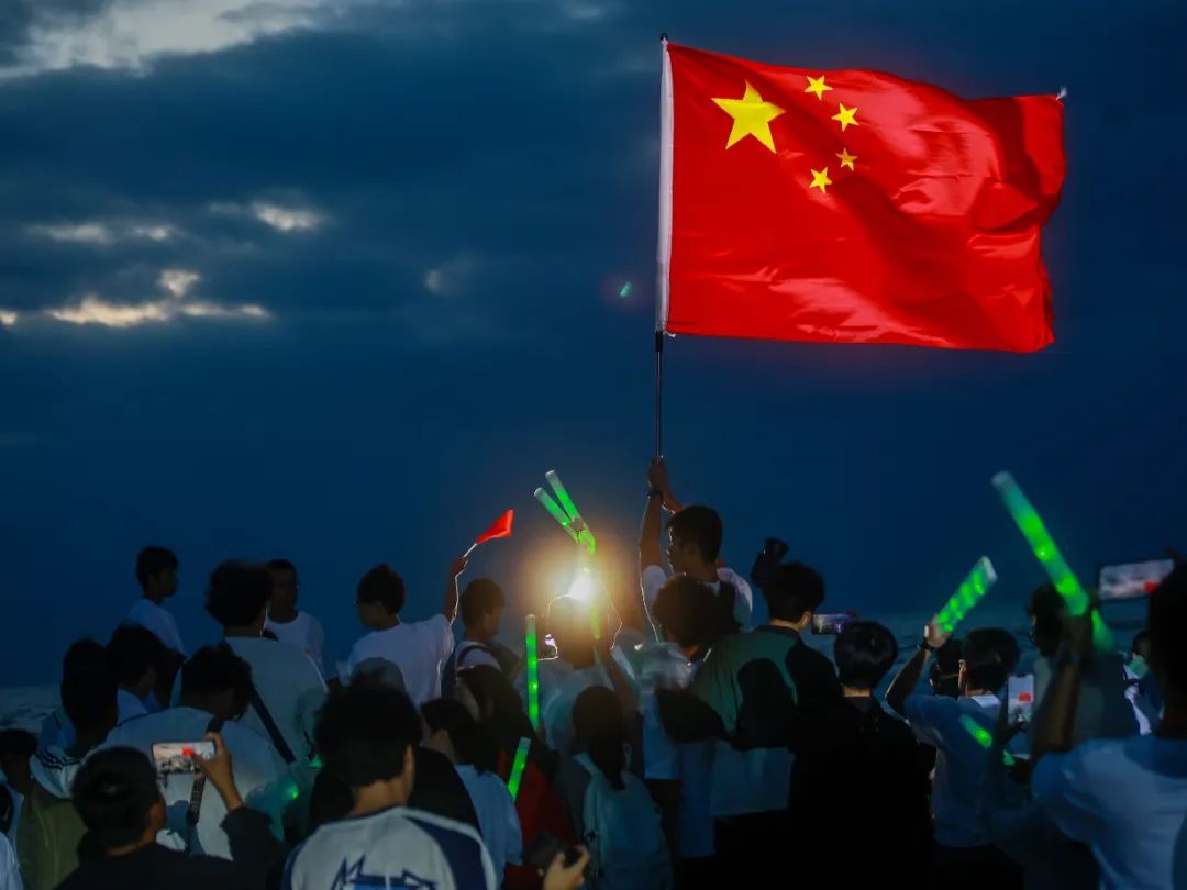 随着东方的鱼肚白渐渐泛起,天色由朦胧转为明亮,工作人员放飞和平鸽和气球。全体人员面向大海,他们手持红旗,脸上洋溢着青春的笑容。耳熟能详的《歌唱祖国》《我爱你中国》等旋律在海风中回荡,海浪的波涛汹涌成为了天然的伴奏。歌声嘹亮有力,回荡在空旷的海滩。每句歌词都充满了对祖国的热爱和对未来的憧憬,这不仅是对祖国母亲的深情祝福,也是对伟大祖国的崇高敬意。